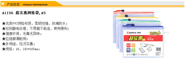 齊心A1156網(wǎng)格拉鏈袋A5*10 配色