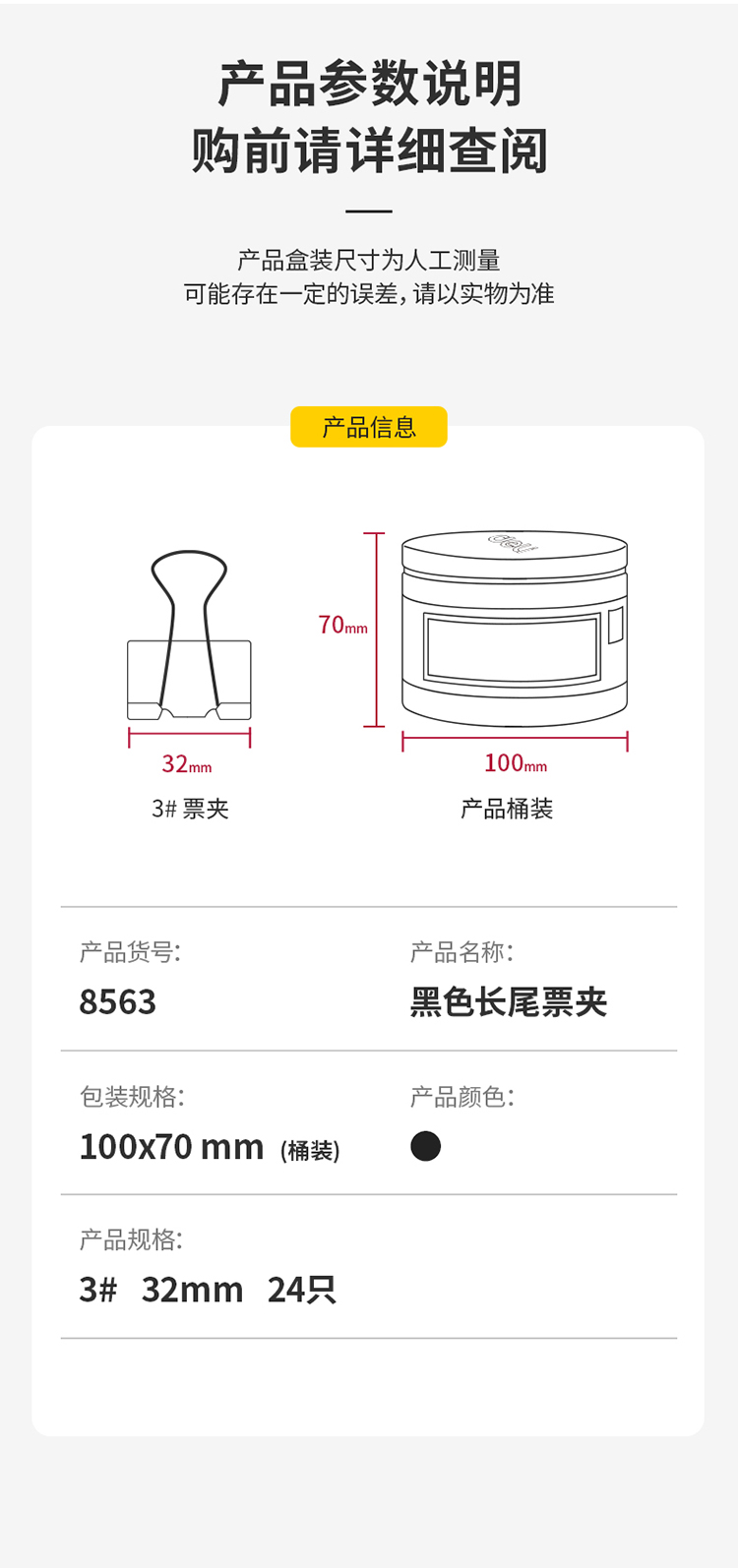 得力8563-3#黑色長尾票夾筒裝32mm*24只/筒