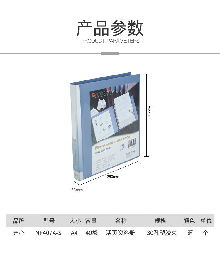 齊心NF407A-S 40頁A4活頁資料冊30孔塑膠夾藍*10