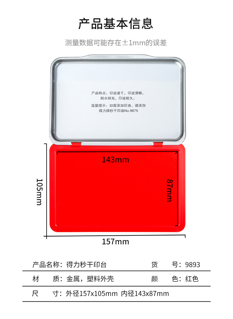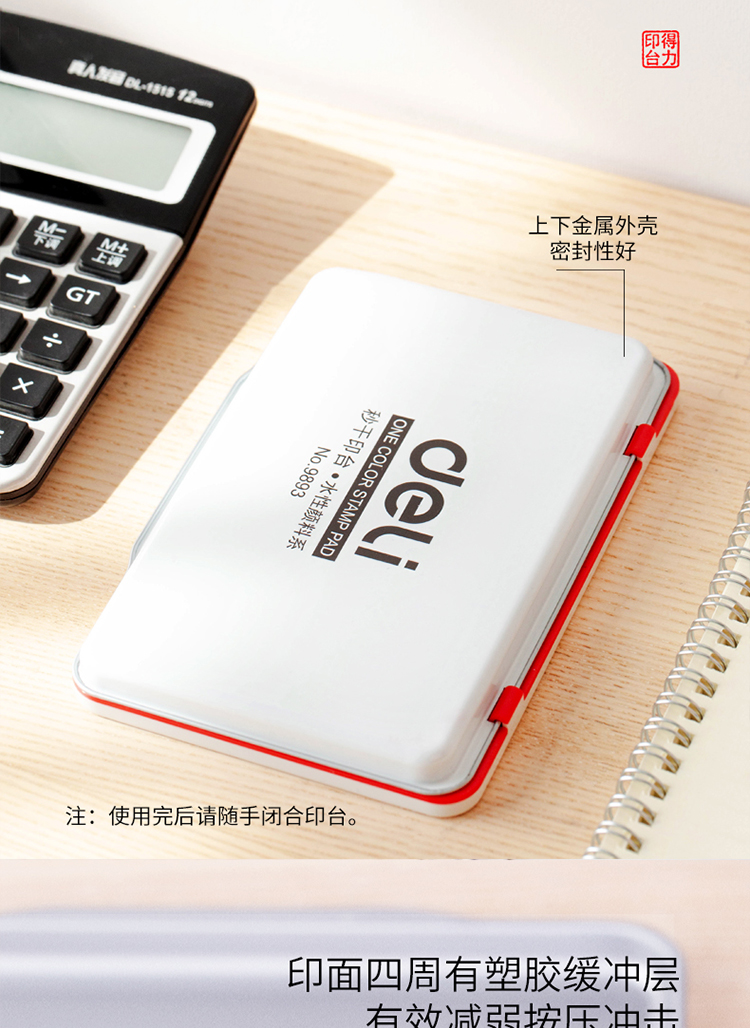 得力9893方形鐵蓋秒干印臺143x87mm(紅)