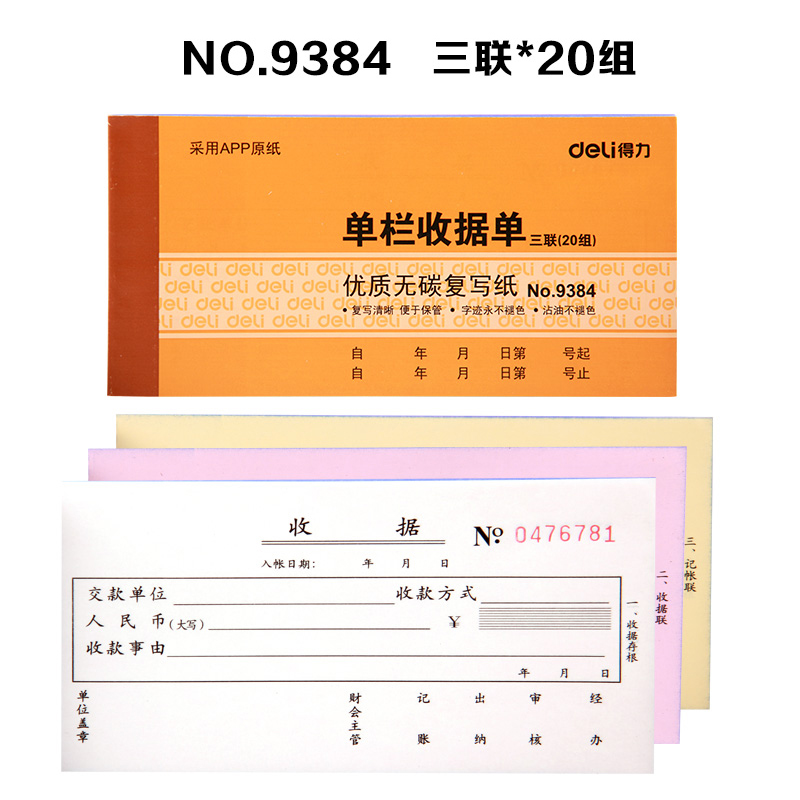 得力9384三聯(lián)單欄收據(jù)(黃)87*175mm*10