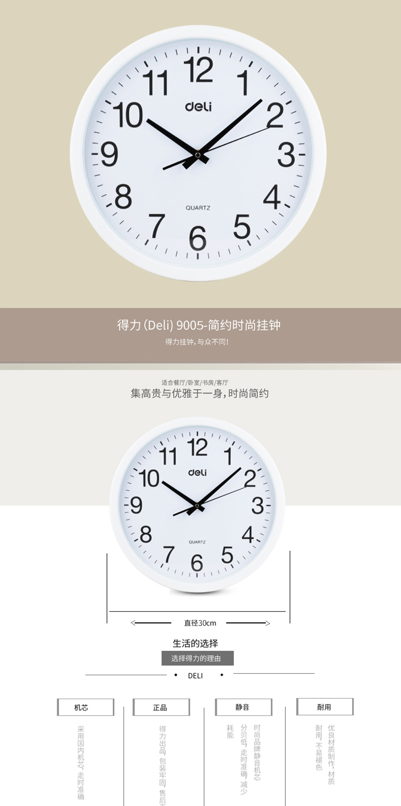 得力9005掛鐘(白)30cm(12寸)