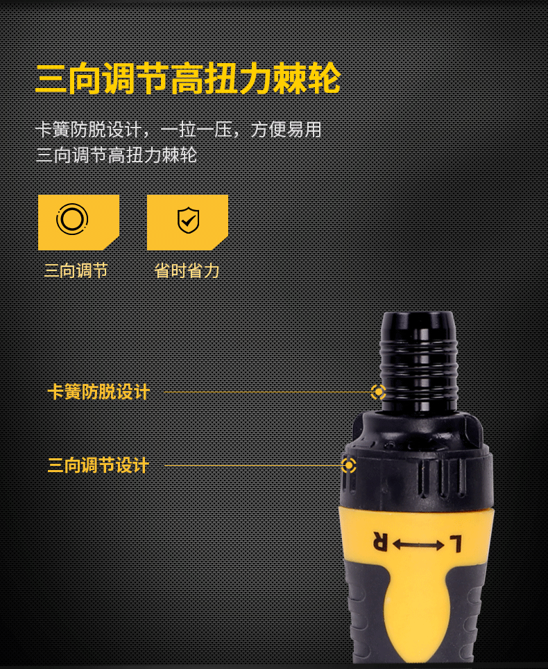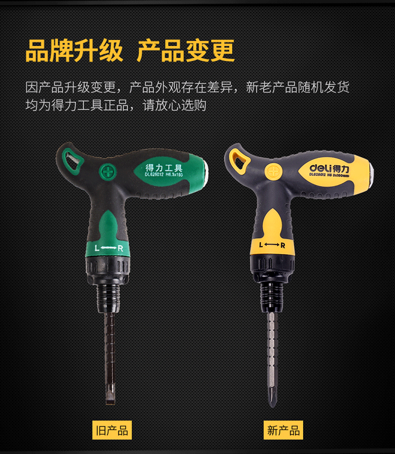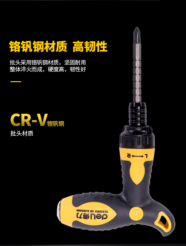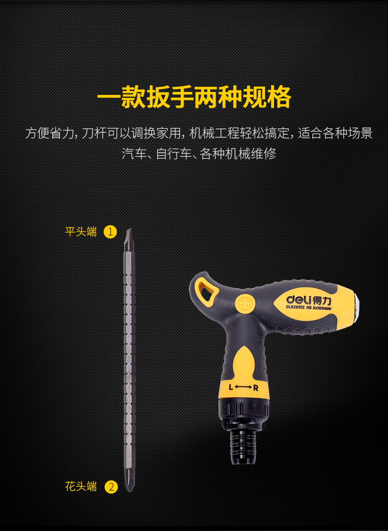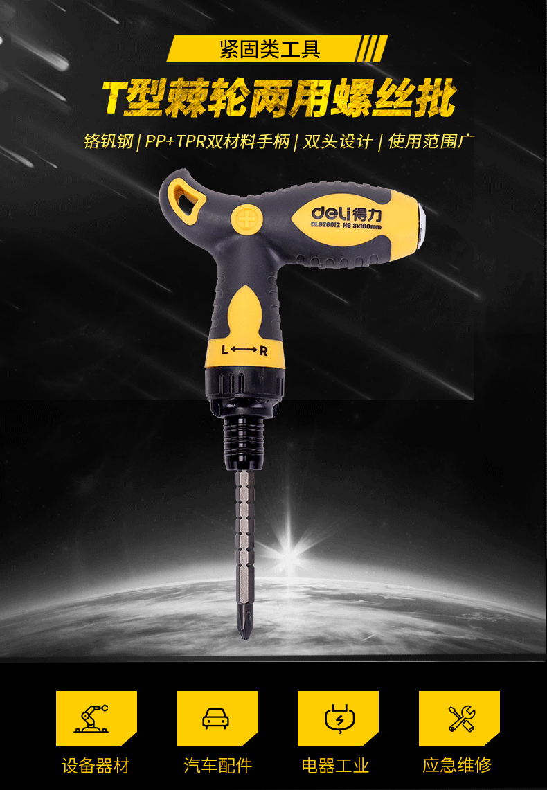 適用類型 : 得力DL626012T型兩用棘輪螺絲批鉻釩鋼(黃)6/PH2x160mm