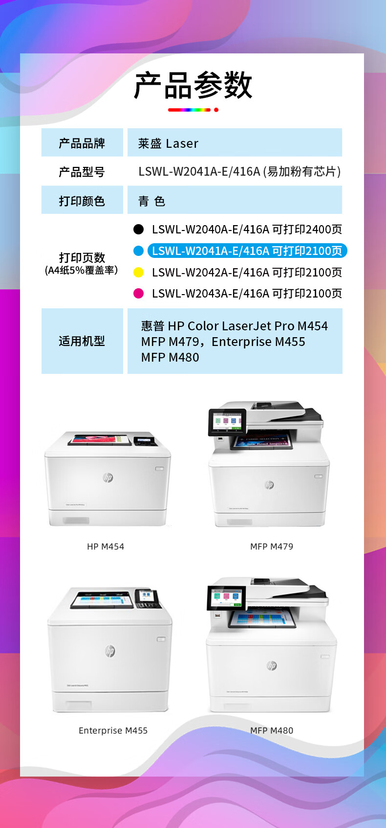 萊盛 LS-W2041A(416A)彩色激光打印機粉盒 青色 全新 有芯片 2.4K 12支/箱